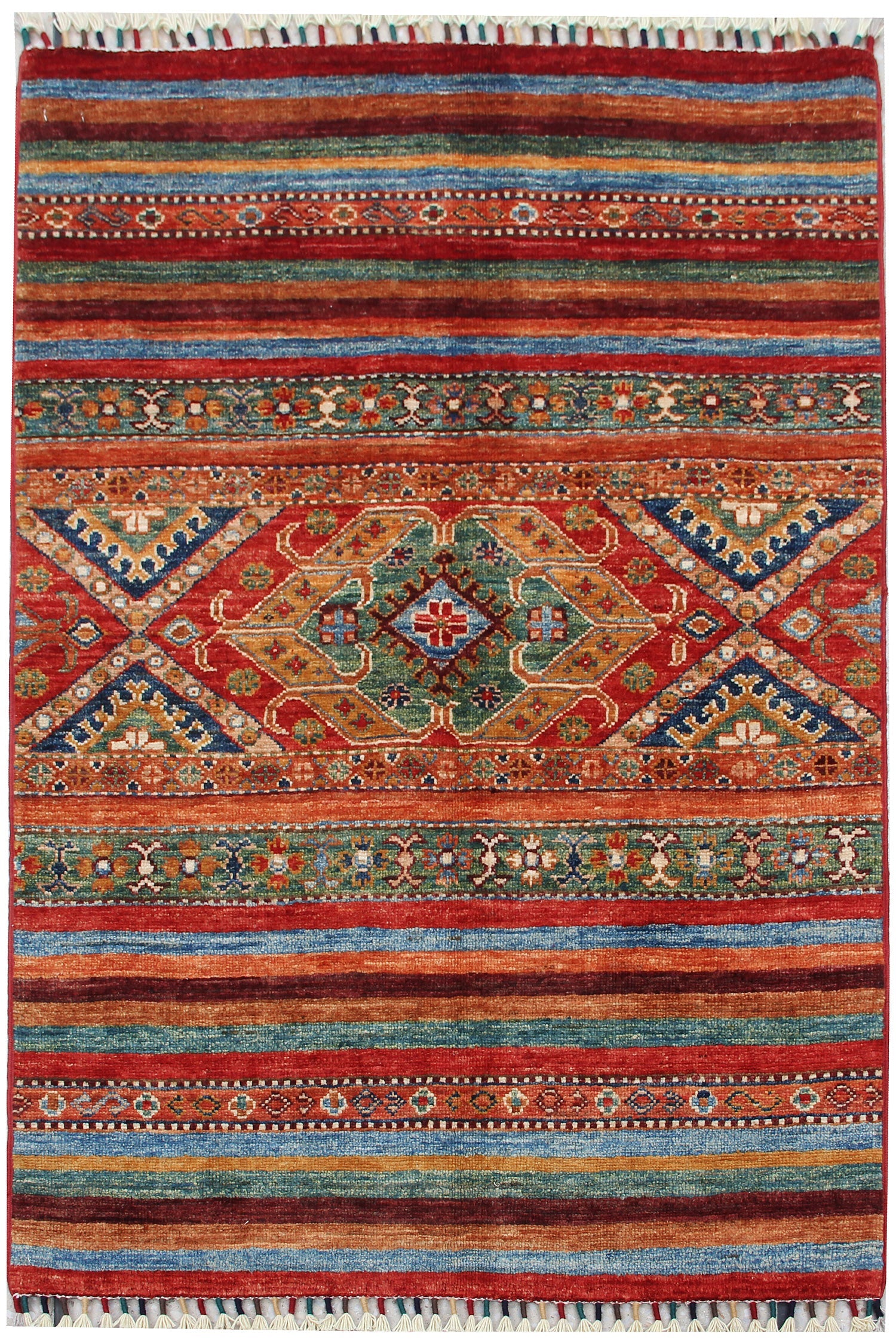 What makes Khurjeen rugs different from the rest is their diversified designs and patterns. The designs draw inspiration from saddlebag designs. These handwoven masterpieces feature rich, multicolored patterns that burst with energy and charm. Pure wool yarns are dyed naturally with cochineal and indigo. Each rug combines durability with stunning detail.