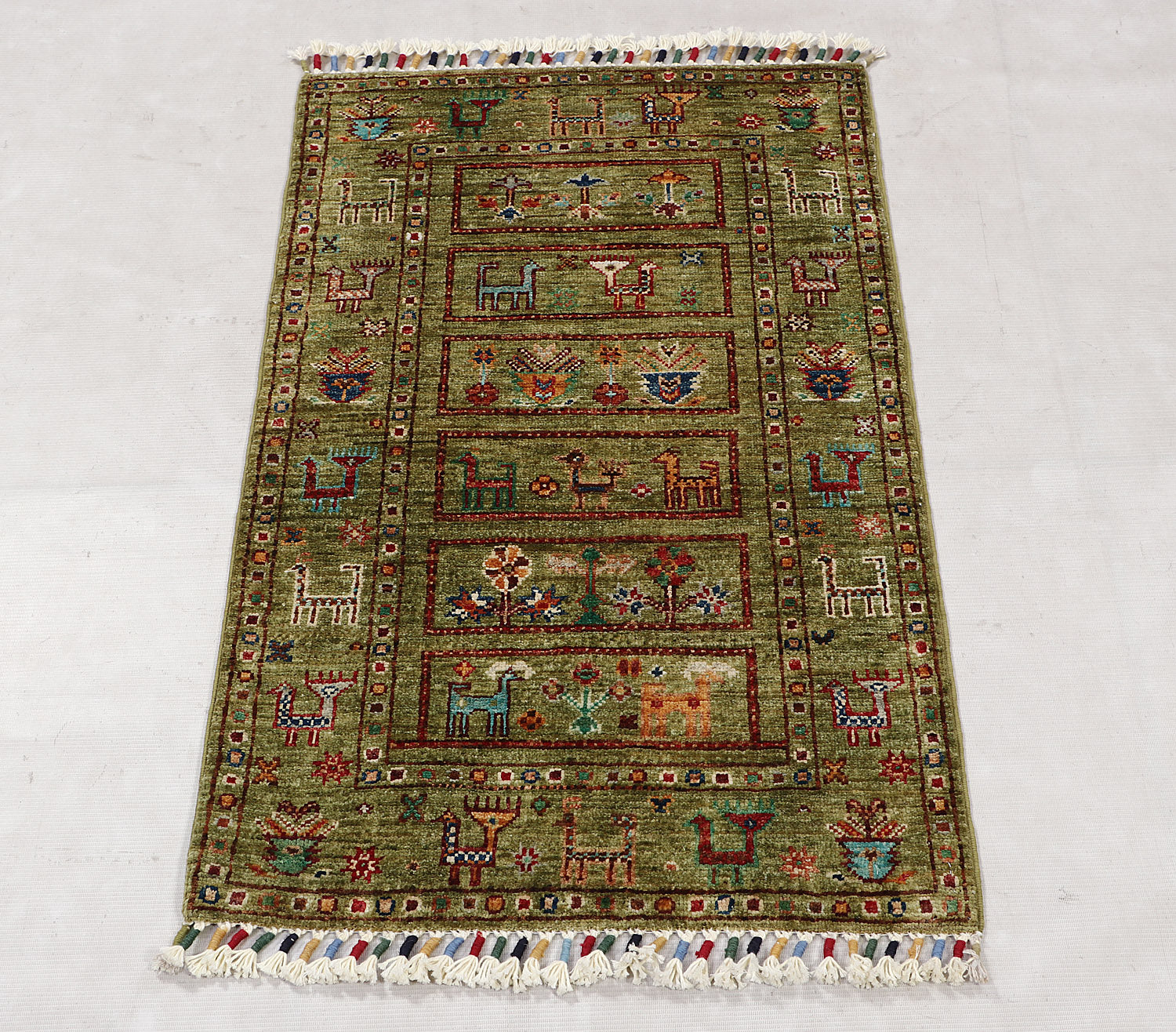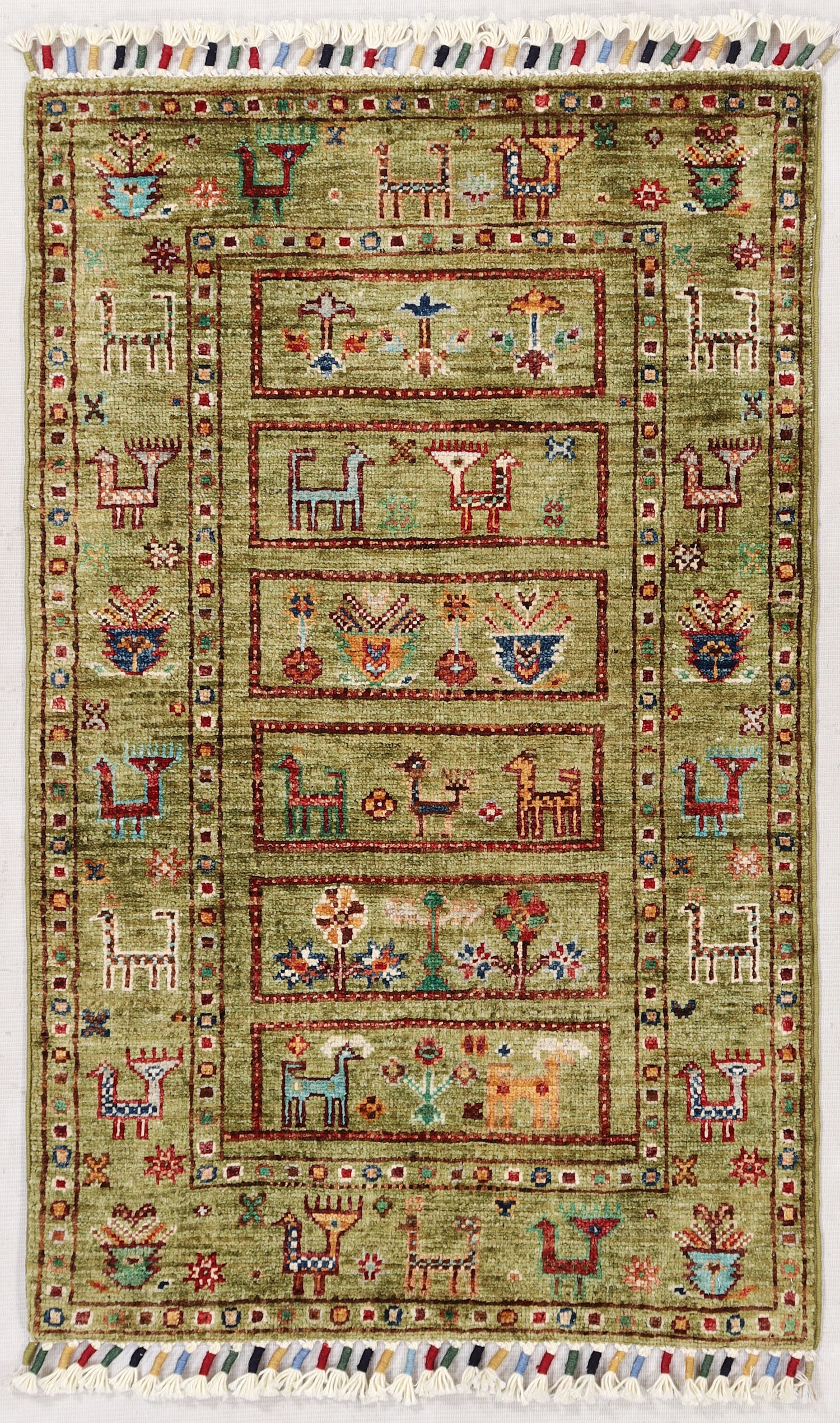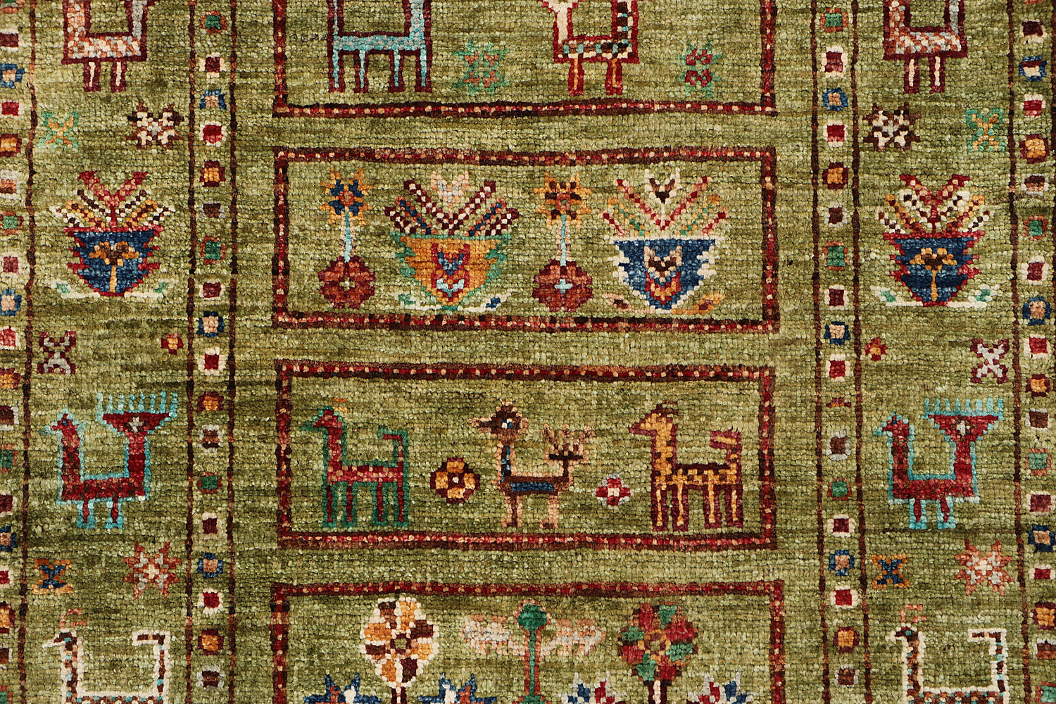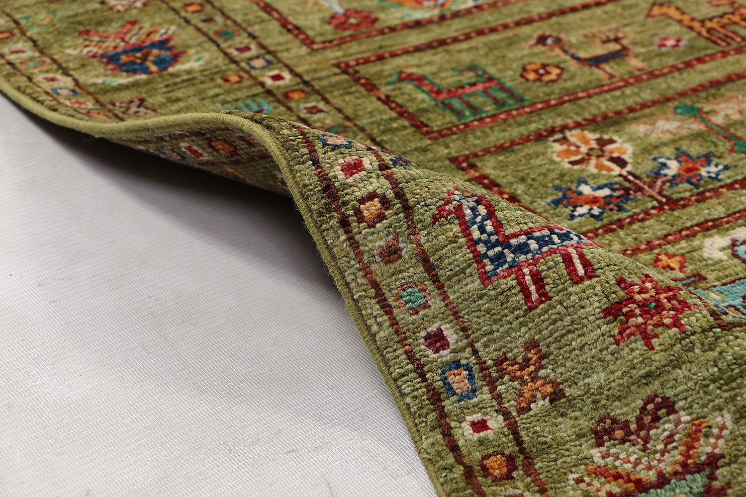 What makes Khurjeen rugs different from the rest is their diversified designs and patterns. The designs draw inspiration from saddlebag designs. These handwoven masterpieces feature rich, multicolored patterns that burst with energy and charm. Pure wool yarns are dyed naturally with cochineal and indigo. Each rug combines durability with stunning detail.