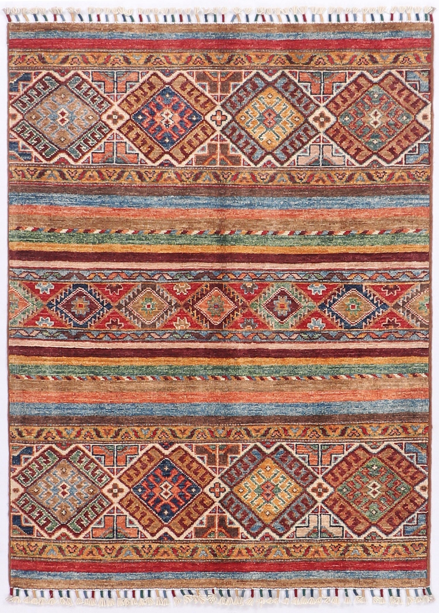 What makes Khurjeen rugs different from the rest is their diversified designs and patterns. The designs draw inspiration from saddlebag designs. These handwoven masterpieces feature rich, multicolored patterns that burst with energy and charm. Pure wool yarns are dyed naturally with cochineal and indigo. Each rug combines durability with stunning detail.