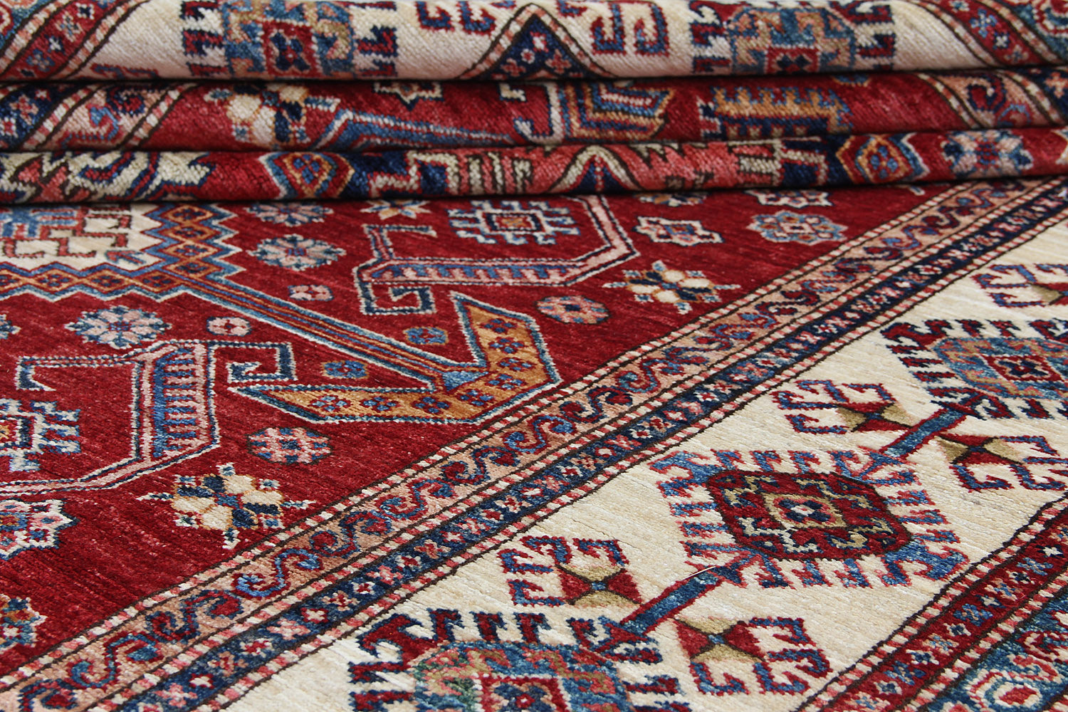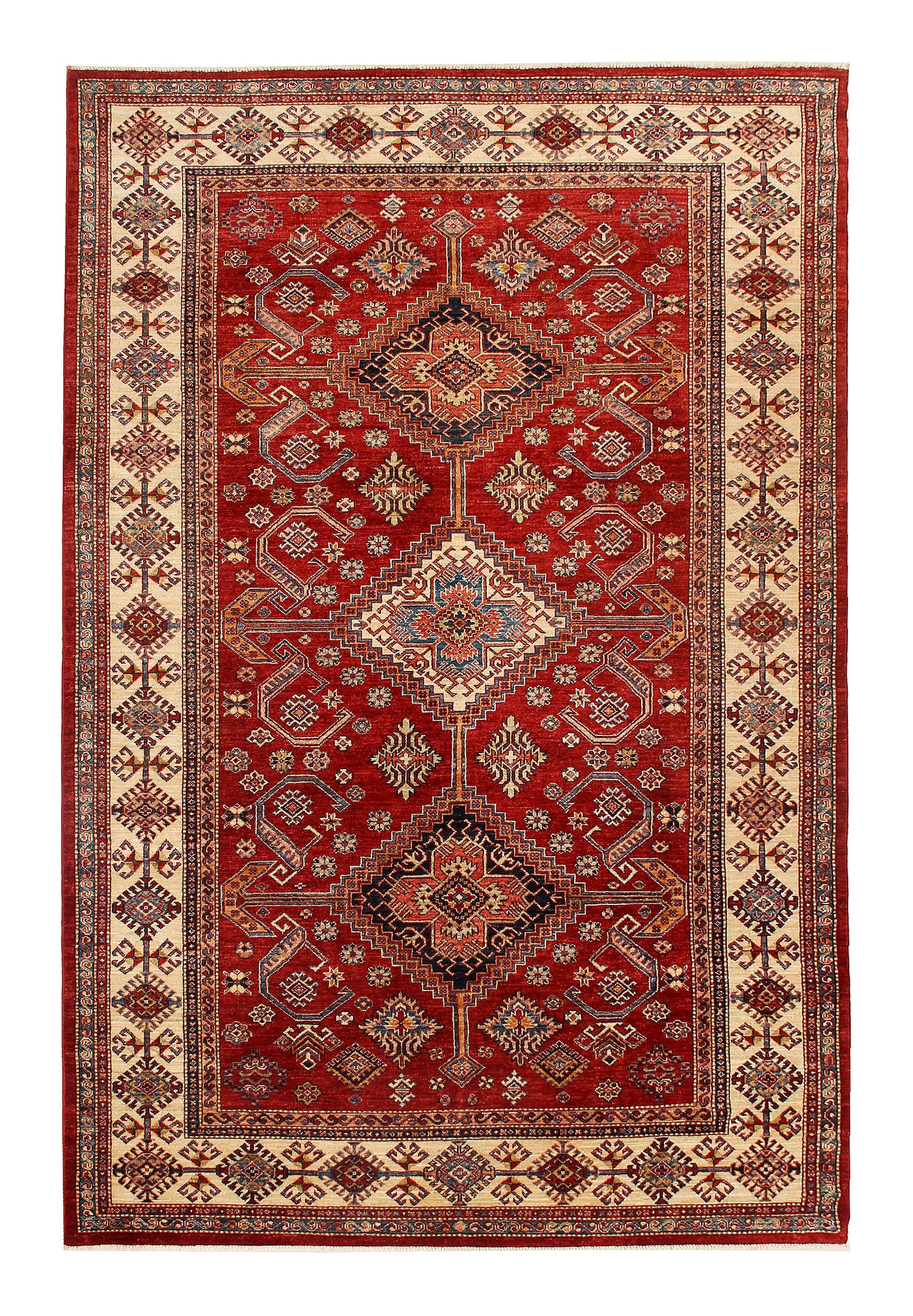 The Supreme Kazak Rug elevates tradition to a whole new level with its rich, intricate patterns and superior craftsmanship. Handwoven with the finest wool and dyed with natural, earthy hues, it exudes timeless elegance and unmatched quality. Its bold geometric designs and striking colors make a powerful statement in any space, while its durability ensures it will stand the test of time.