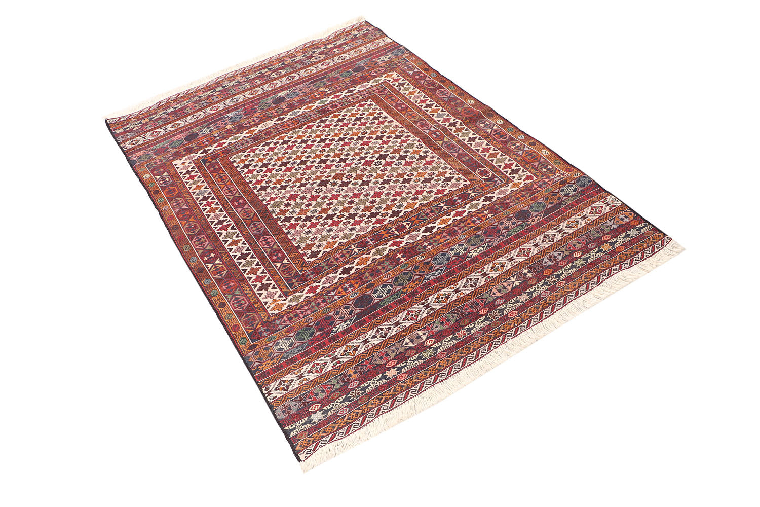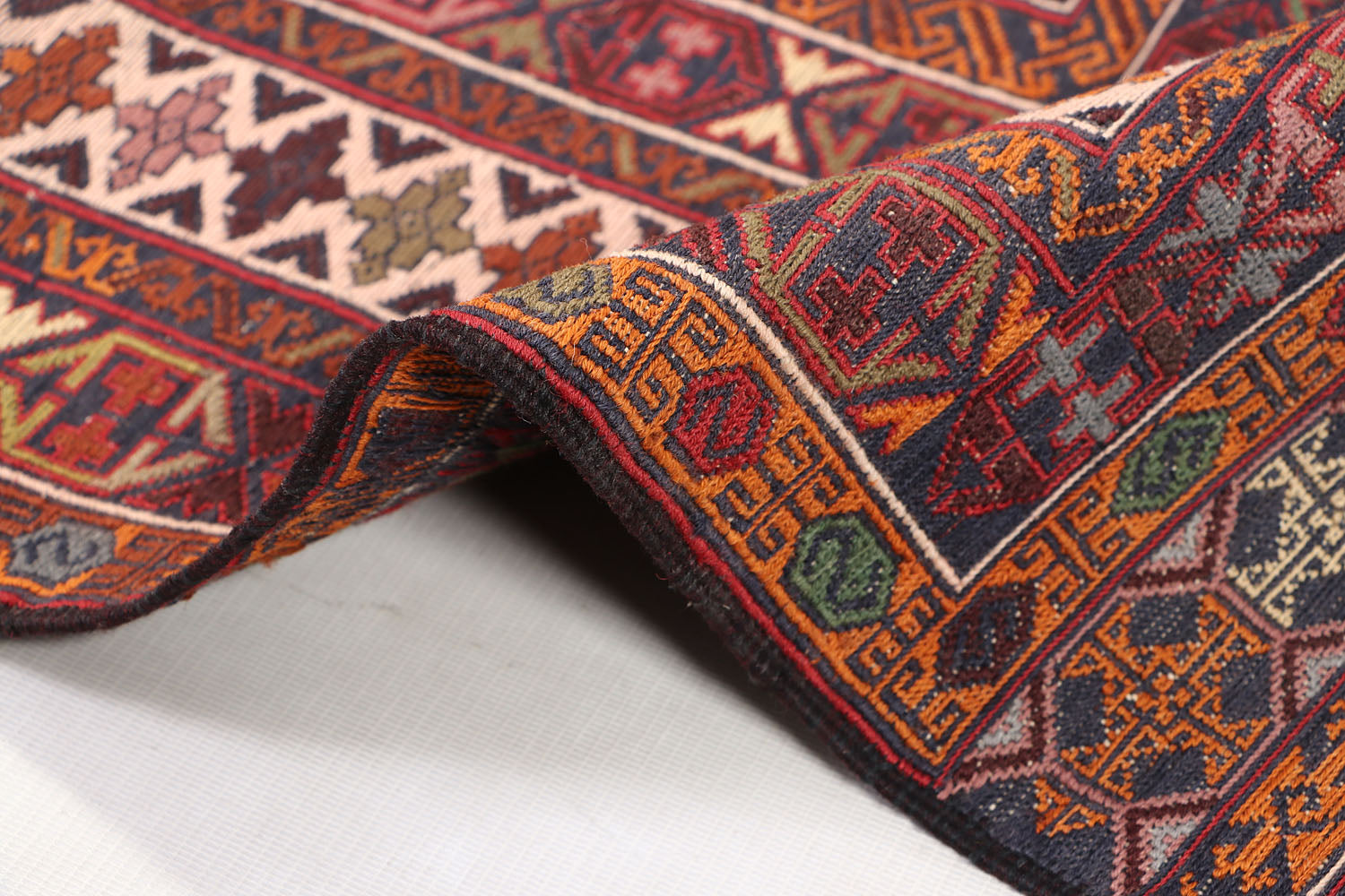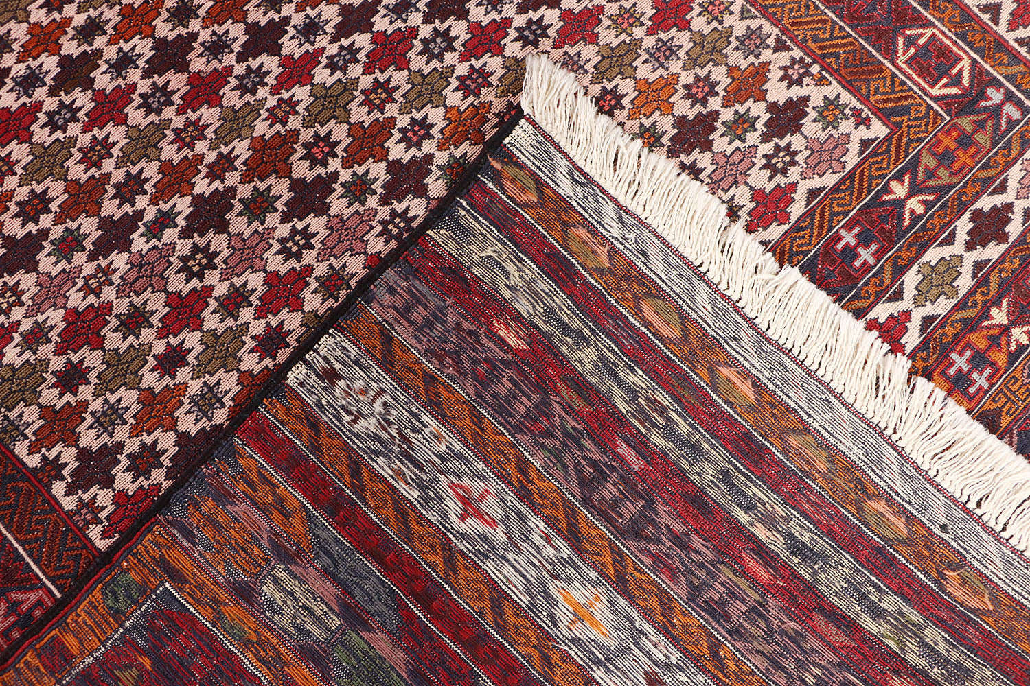 The Biljik Maliki rug blends bold colors with symmetrical geometric patterns. These rugs are handwoven with premium wool and offer a luxurious texture and a striking visual appeal.