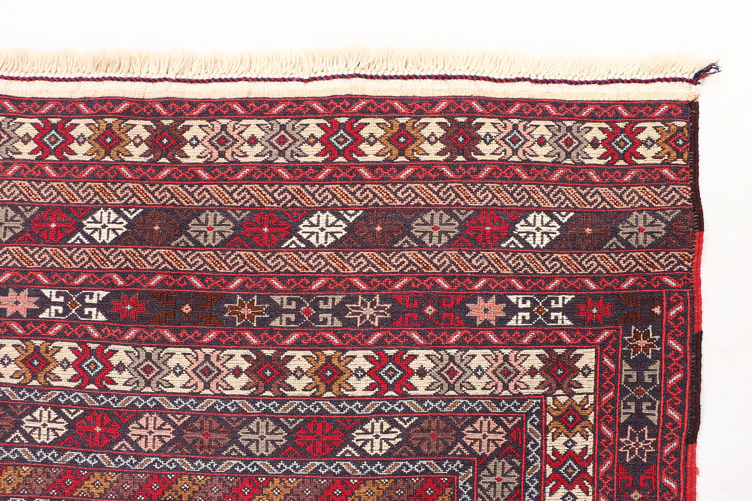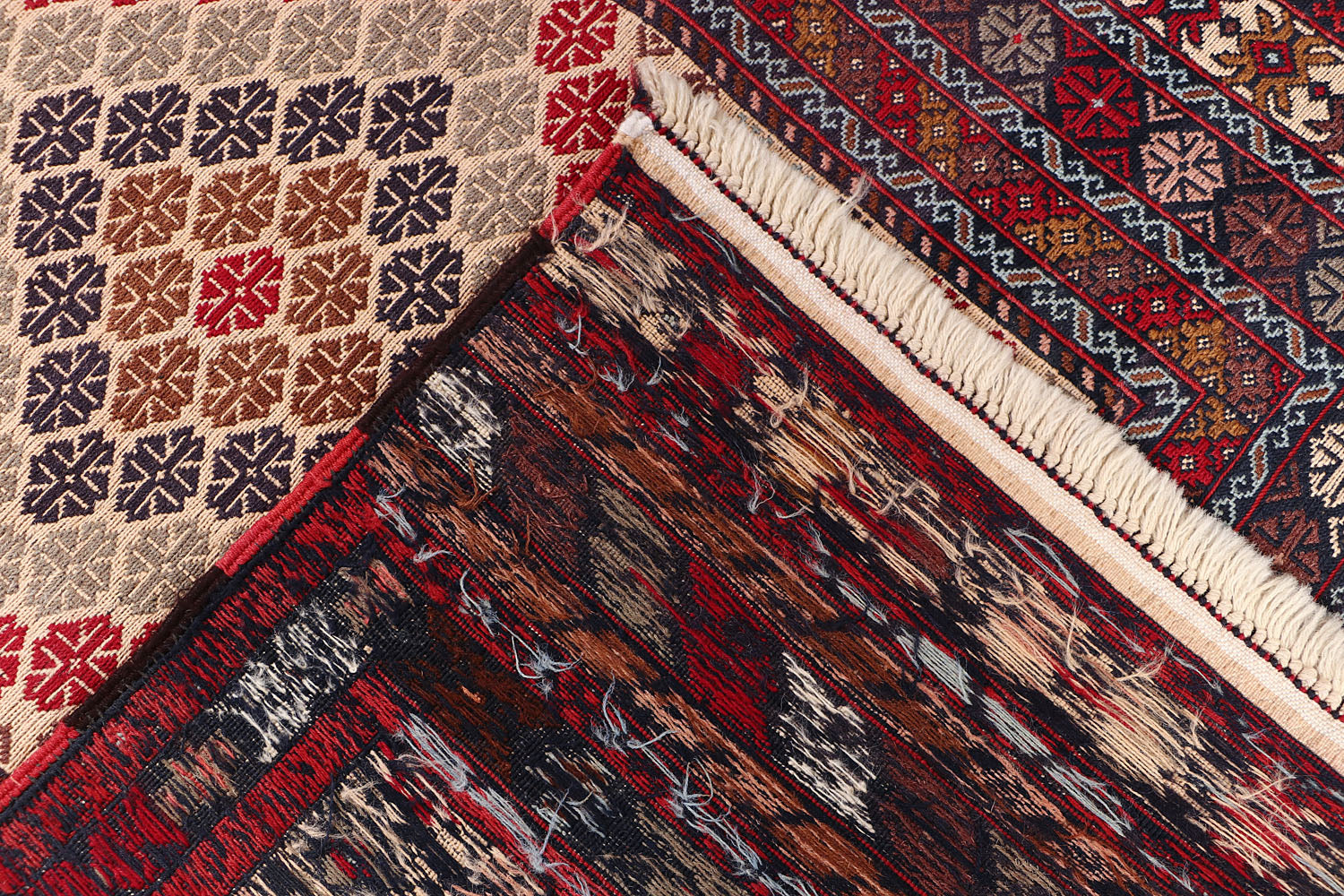 The Biljik Maliki rug blends bold colors with symmetrical geometric patterns. These rugs are handwoven with premium wool and offer a luxurious texture and a striking visual appeal.