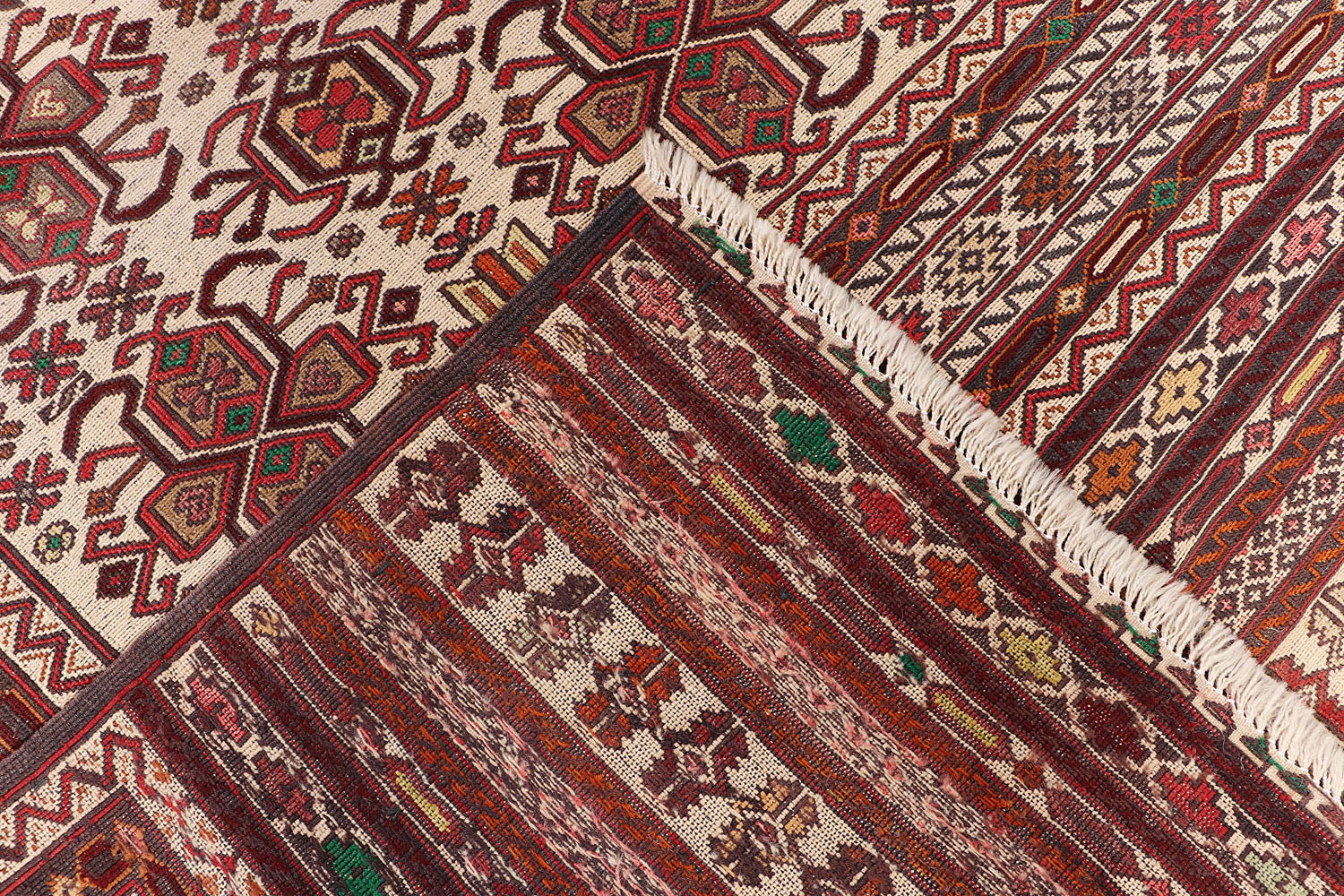 The Biljik Maliki rug blends bold colors with symmetrical geometric patterns. These rugs are handwoven with premium wool and offer a luxurious texture and a striking visual appeal.