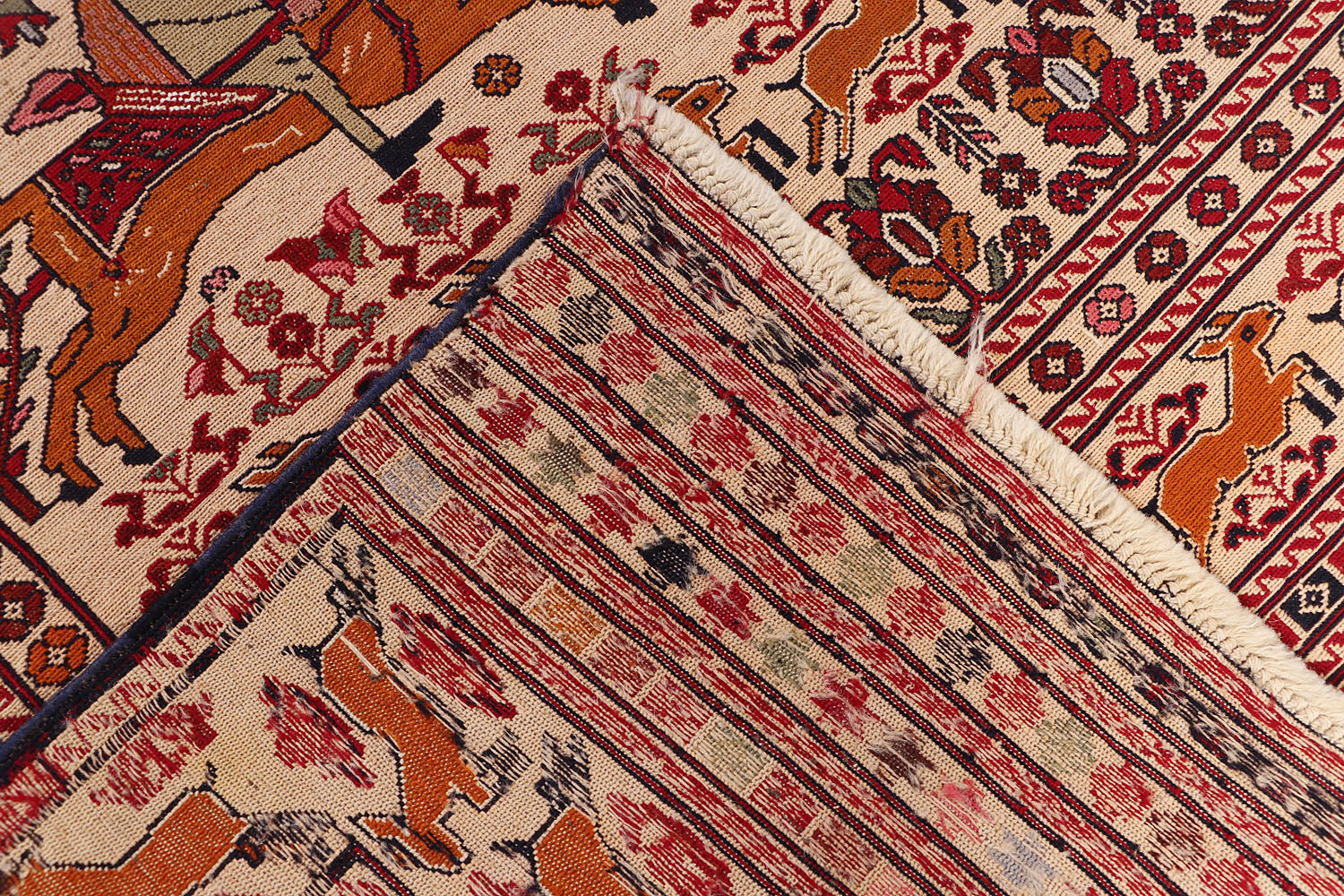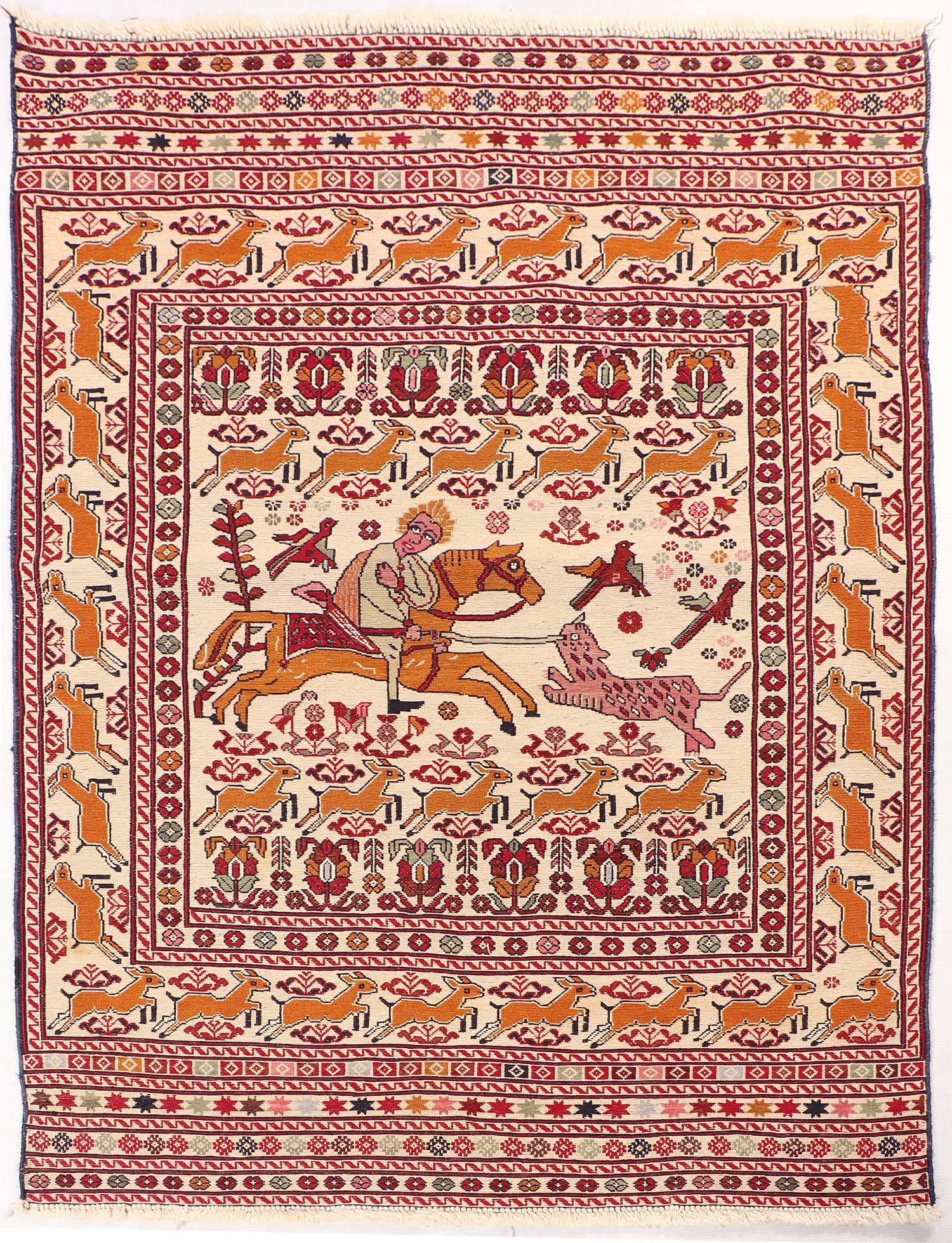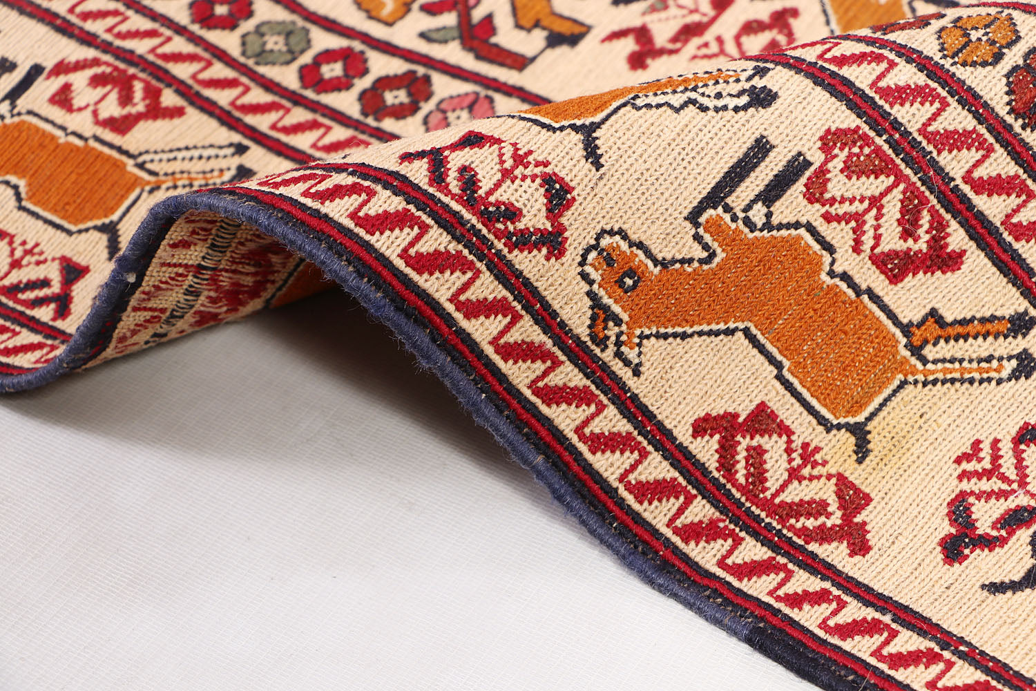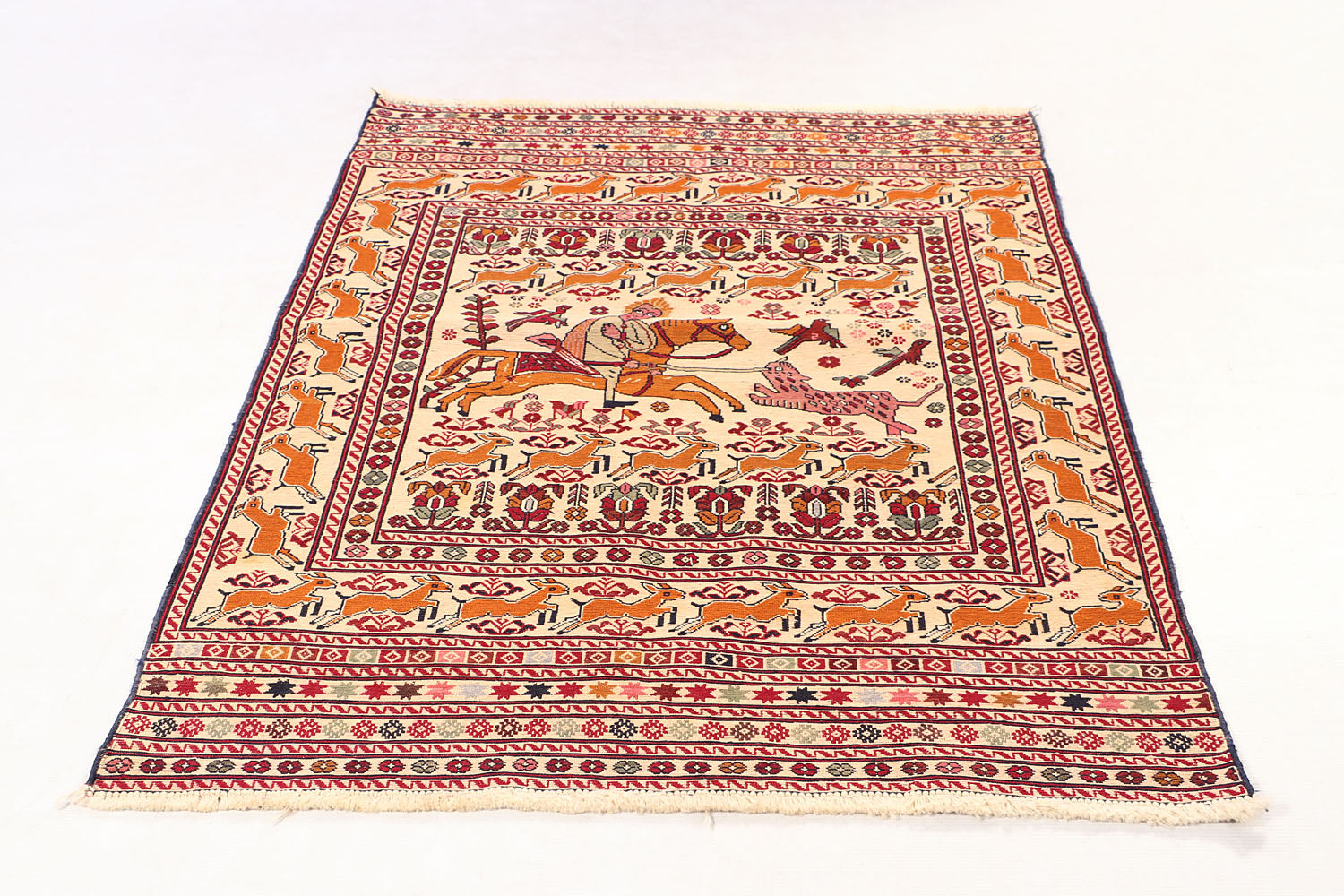 The Biljik Maliki rug blends bold colors with symmetrical geometric patterns. These rugs are handwoven with premium wool and offer a luxurious texture and a striking visual appeal.