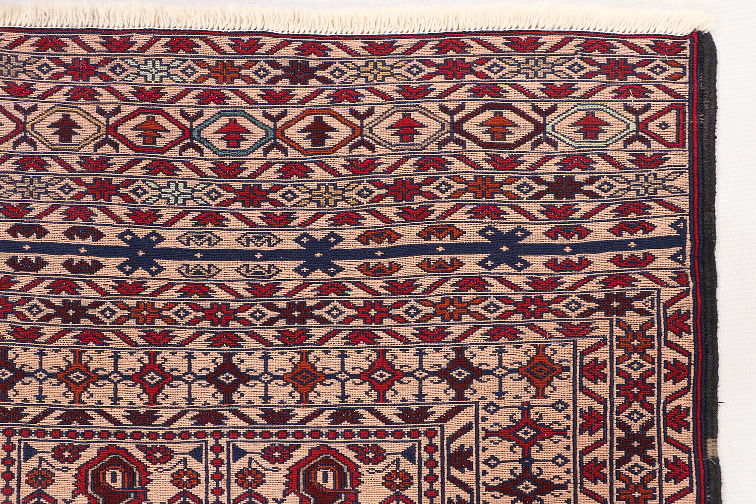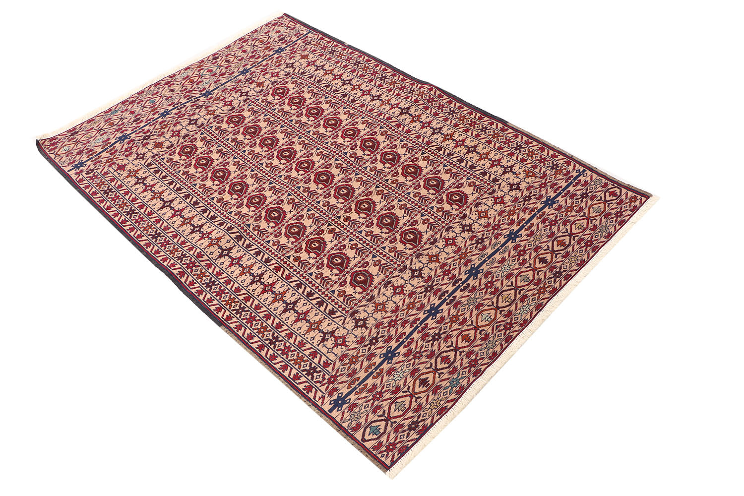 The Biljik Maliki rug blends bold colors with symmetrical geometric patterns. These rugs are handwoven with premium wool and offer a luxurious texture and a striking visual appeal.