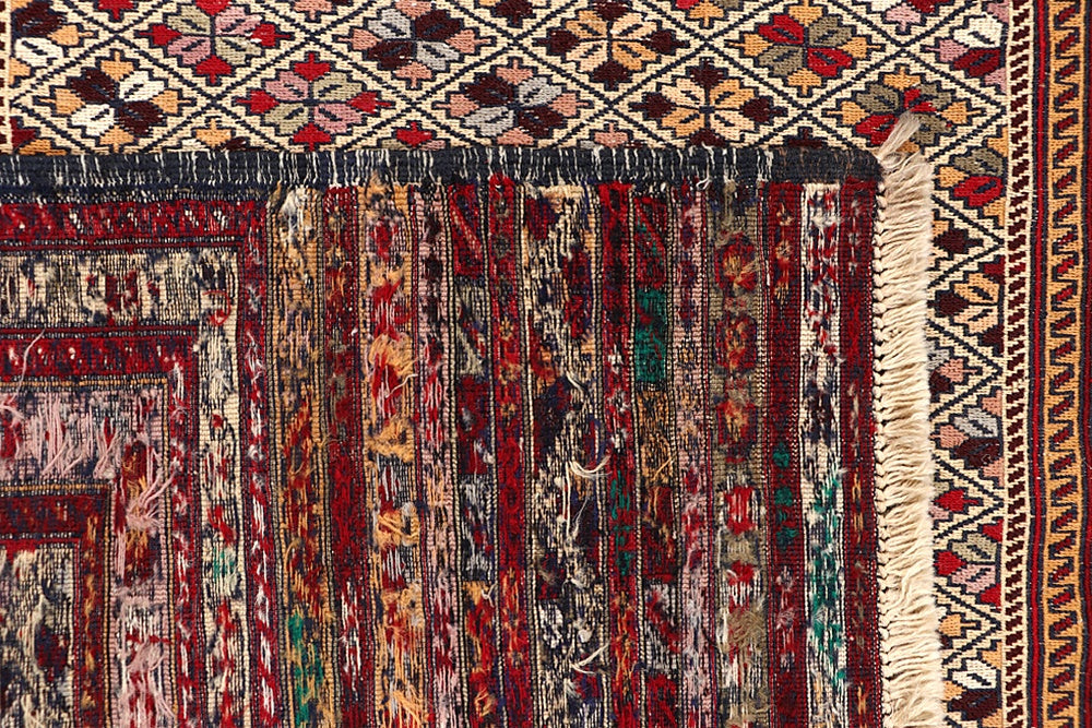 The Biljik Maliki rug blends bold colors with symmetrical geometric patterns. These rugs are handwoven with premium wool and offer a luxurious texture and a striking visual appeal.