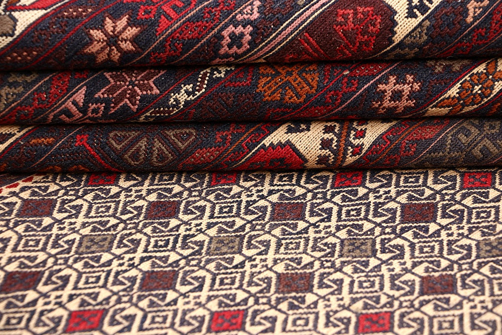 The Biljik Maliki rug blends bold colors with symmetrical geometric patterns. These rugs are handwoven with premium wool and offer a luxurious texture and a striking visual appeal.