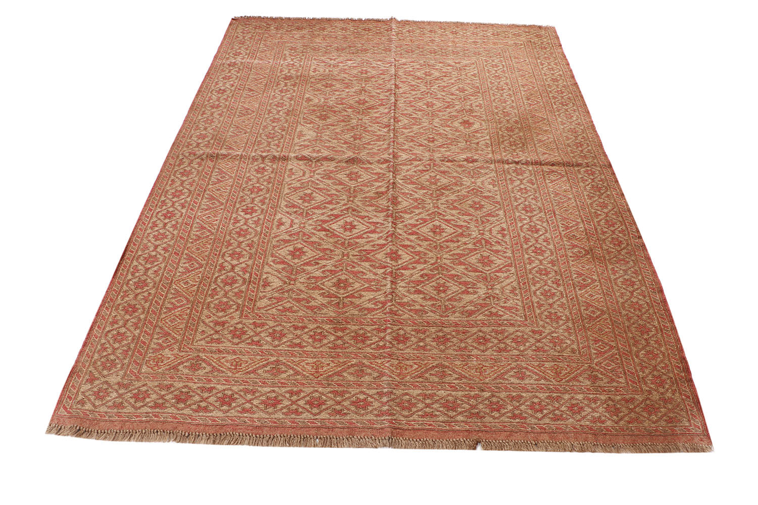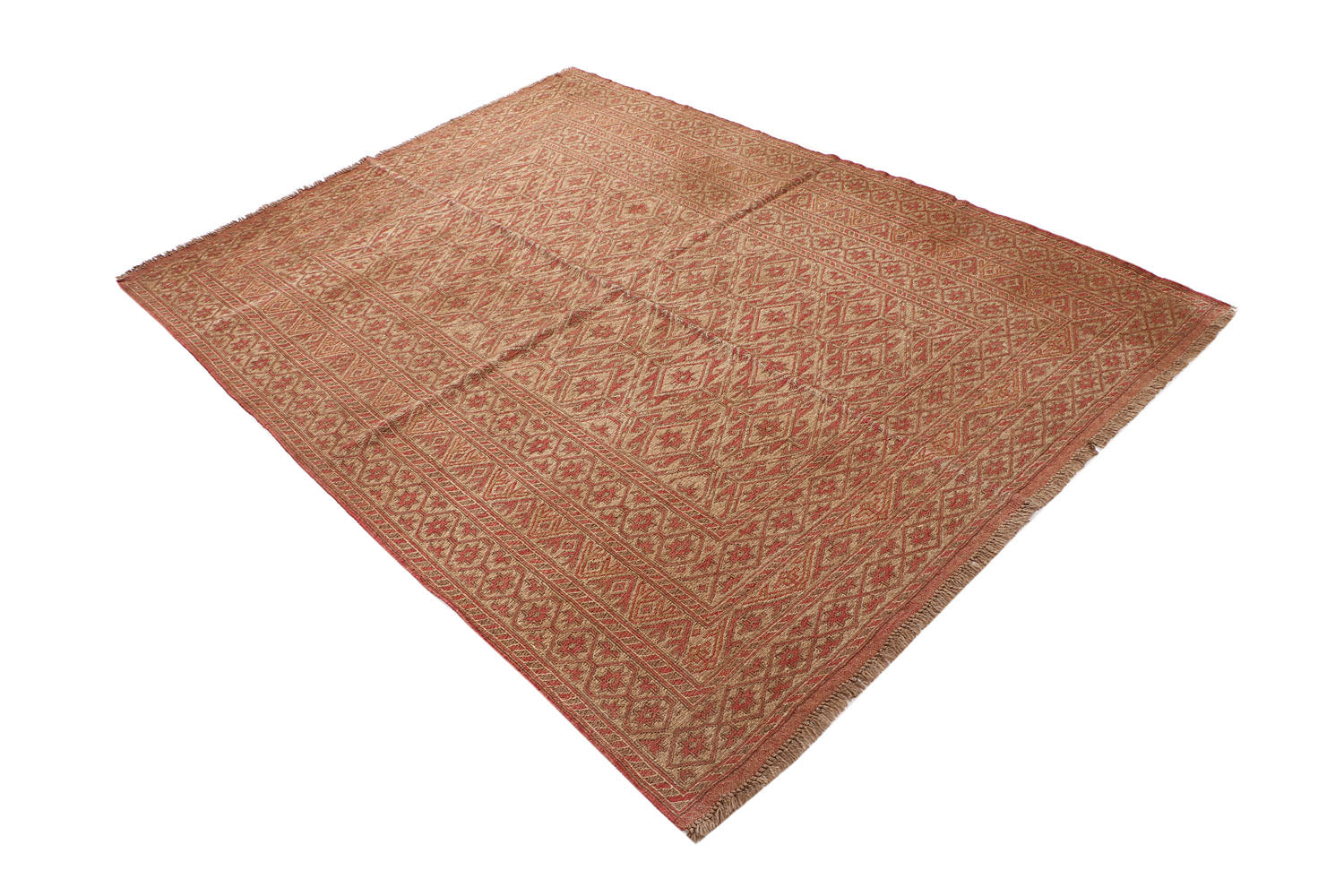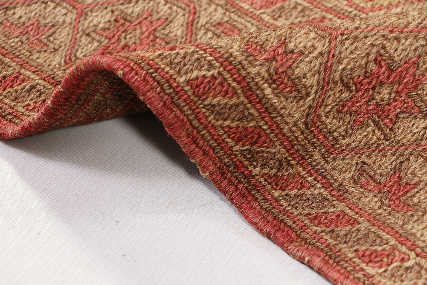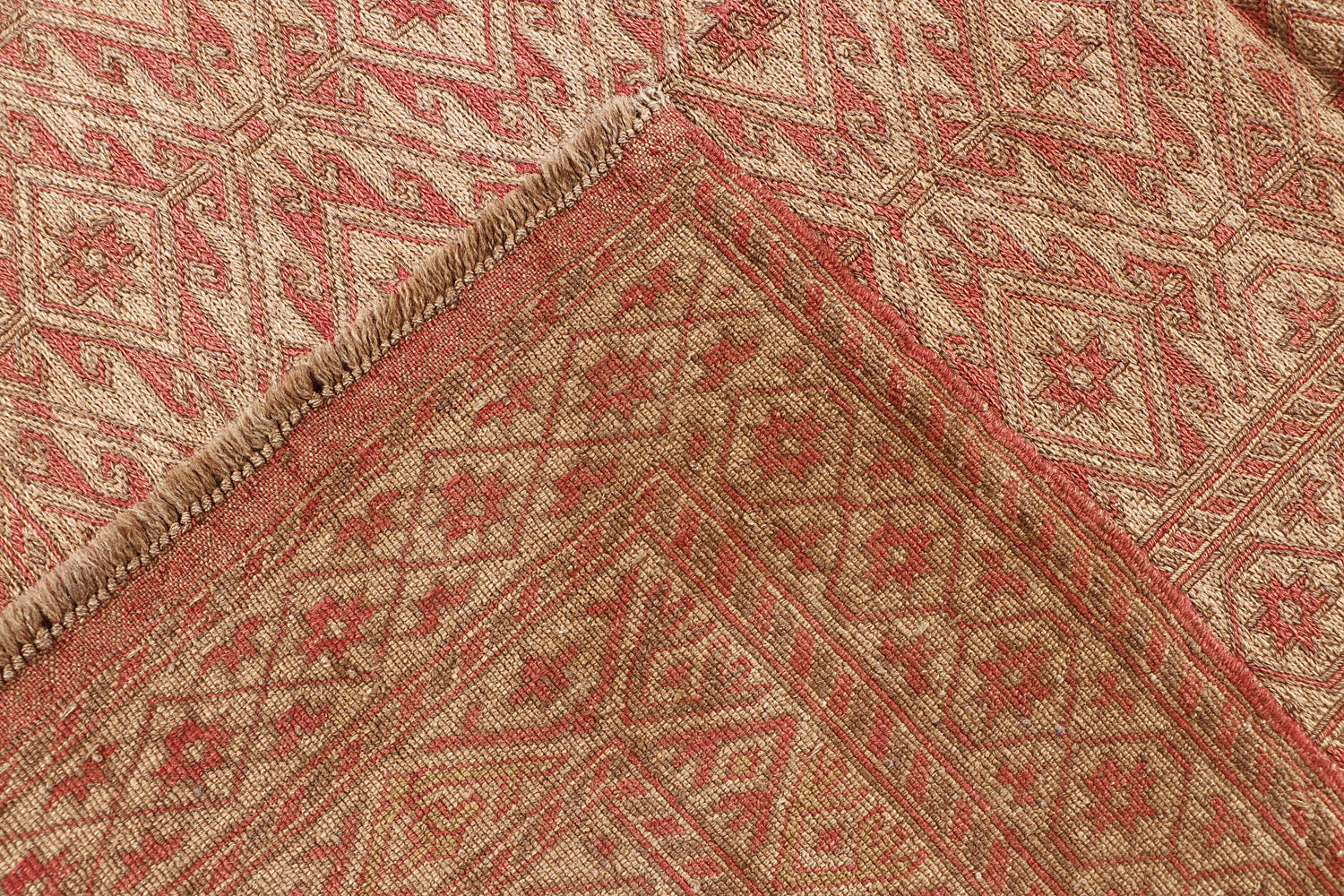 The Kalainow rug features complex tribal designs in warm, earthy tones. Its handwoven craftsmanship reflects traditional artistry while fitting seamlessly into modern homes.