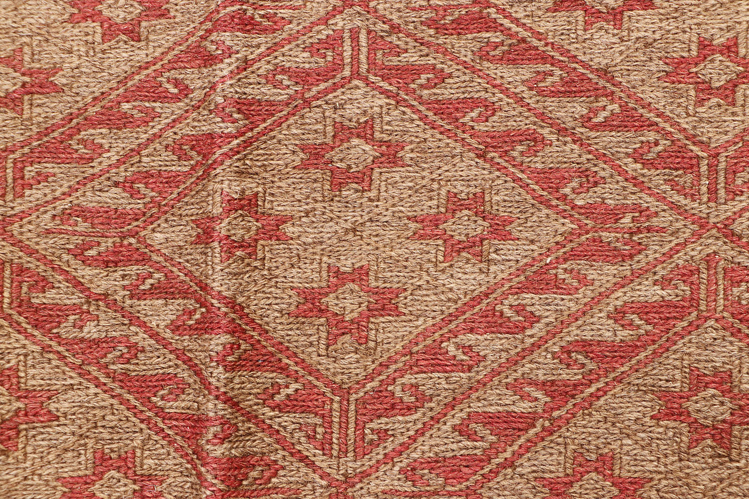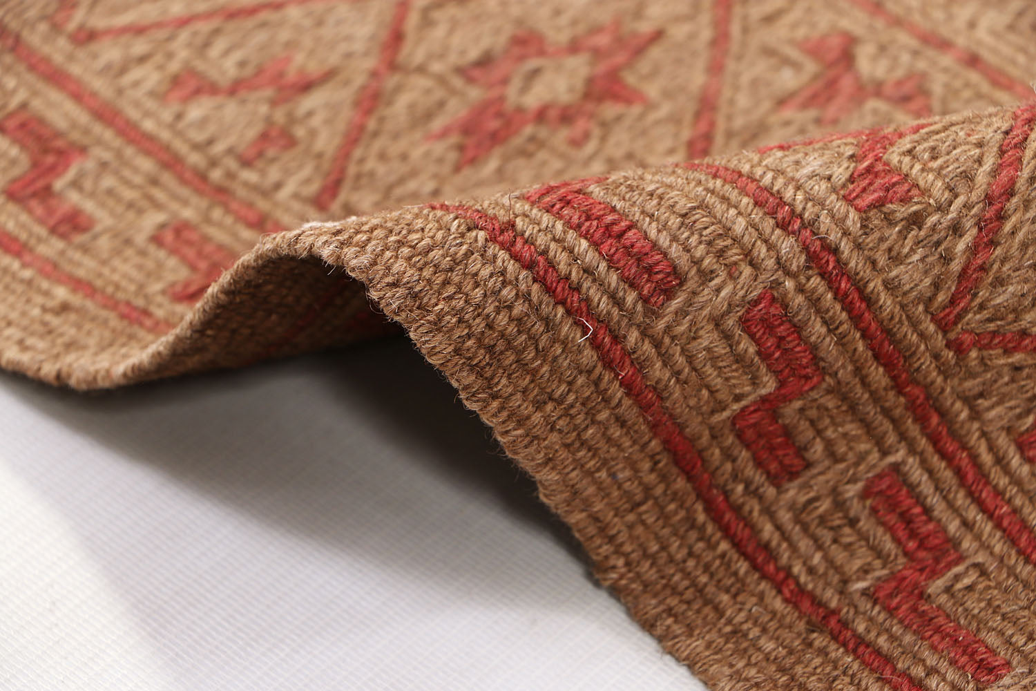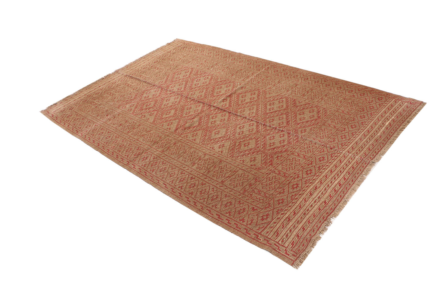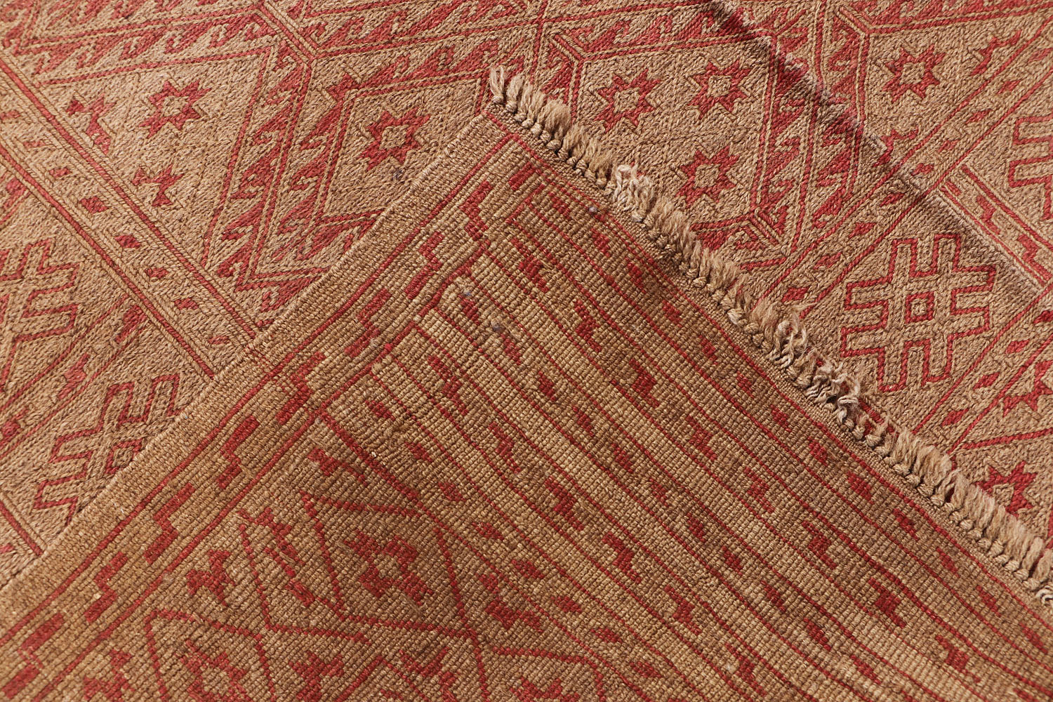 The Kalainow rug features complex tribal designs in warm, earthy tones. Its handwoven craftsmanship reflects traditional artistry while fitting seamlessly into modern homes.