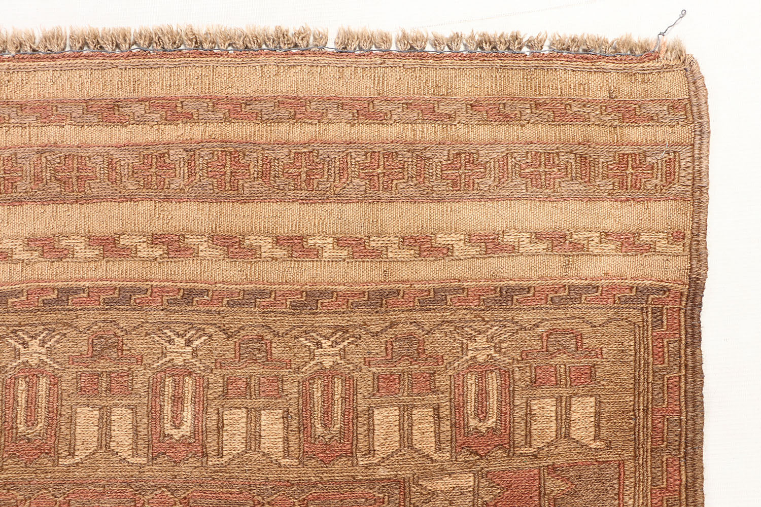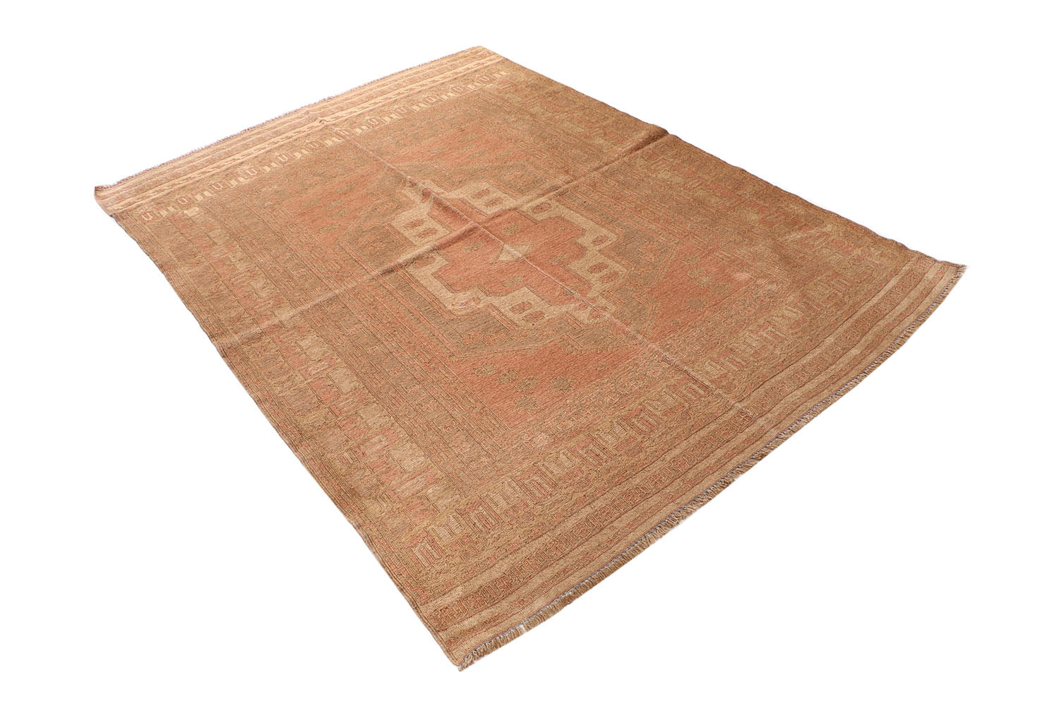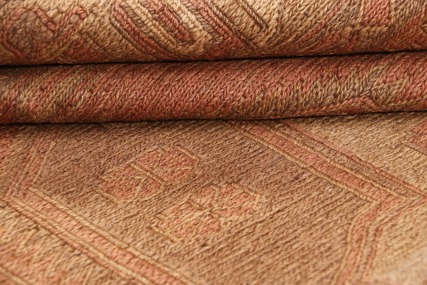 The Kalainow rug features complex tribal designs in warm, earthy tones. Its handwoven craftsmanship reflects traditional artistry while fitting seamlessly into modern homes.