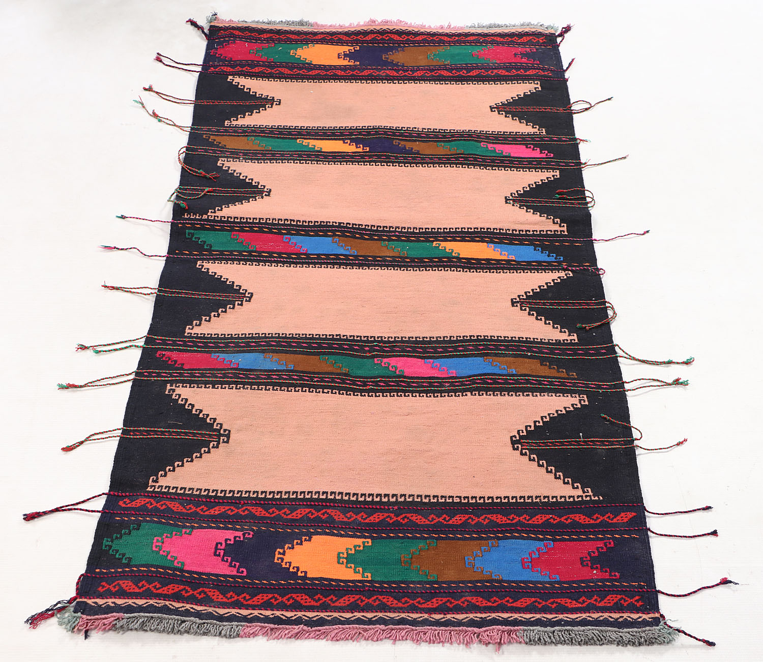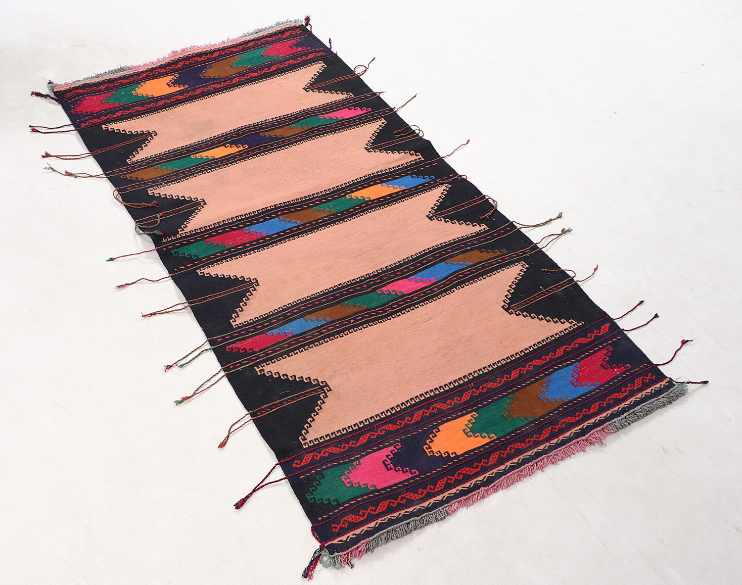 The Sufra rug, traditionally used as a multipurpose floor spread, combines durable flat-weave construction with simple, functional patterns. Its practical design fits perfectly in casual or utility spaces.