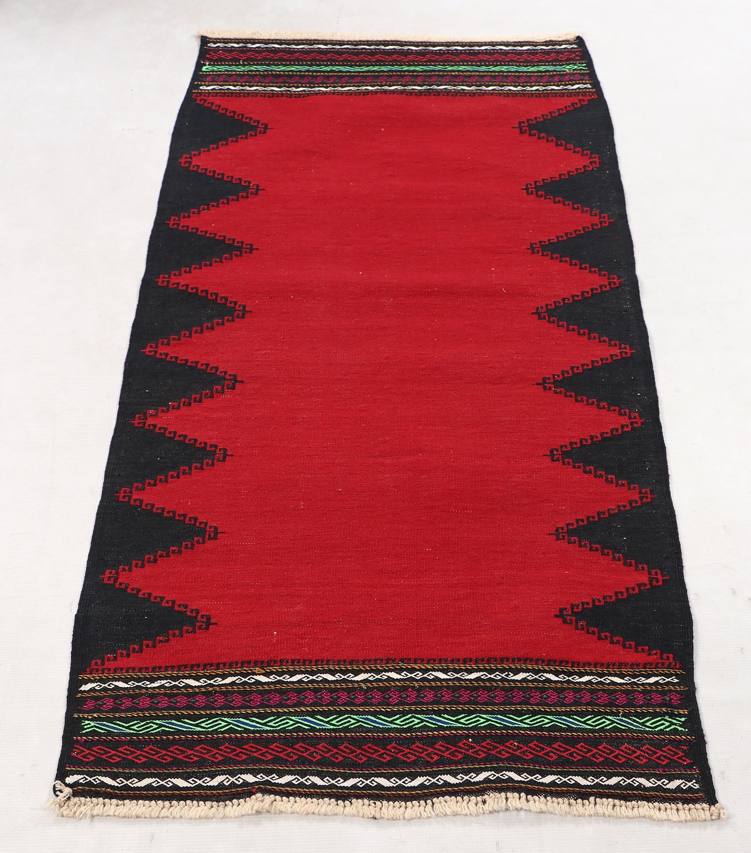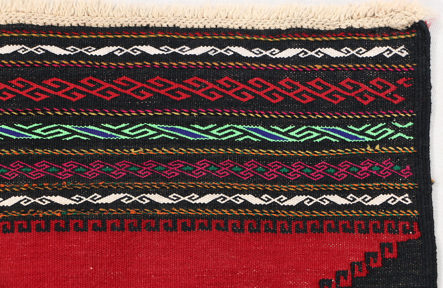 The Sufra rug, traditionally used as a multipurpose floor spread, combines durable flat-weave construction with simple, functional patterns. Its practical design fits perfectly in casual or utility spaces.