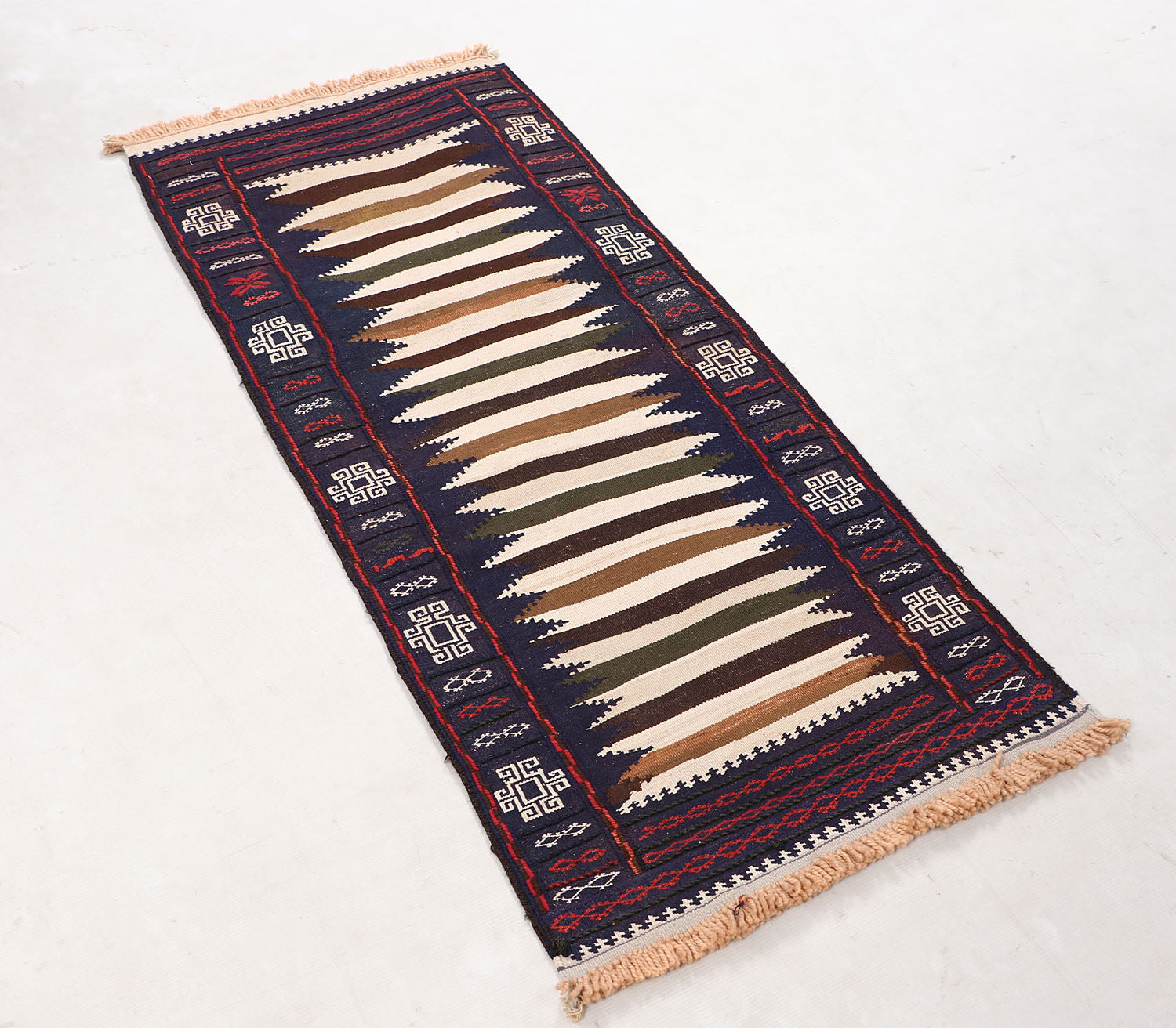 The Sufra rug, traditionally used as a multipurpose floor spread, combines durable flat-weave construction with simple, functional patterns. Its practical design fits perfectly in casual or utility spaces.