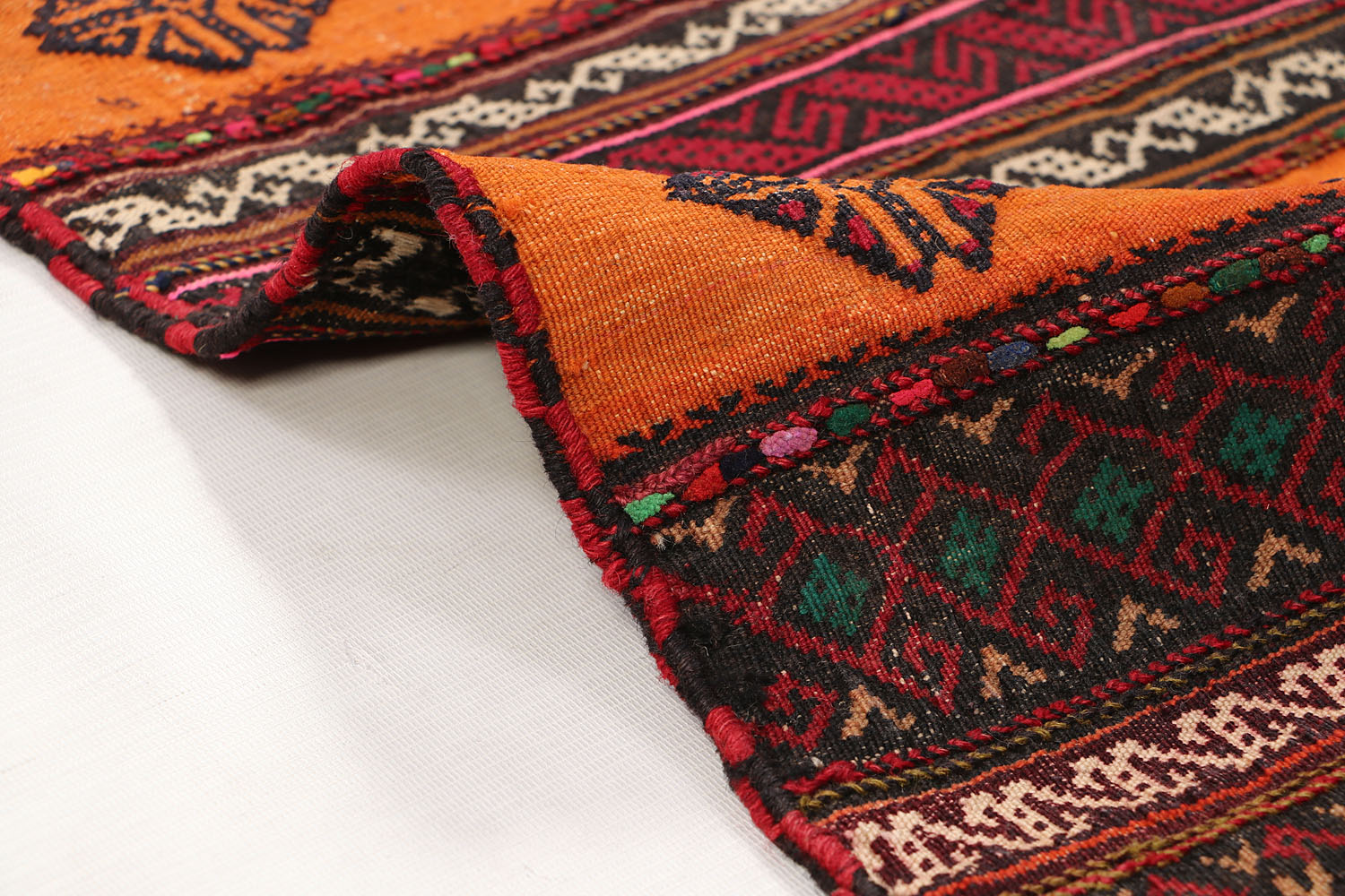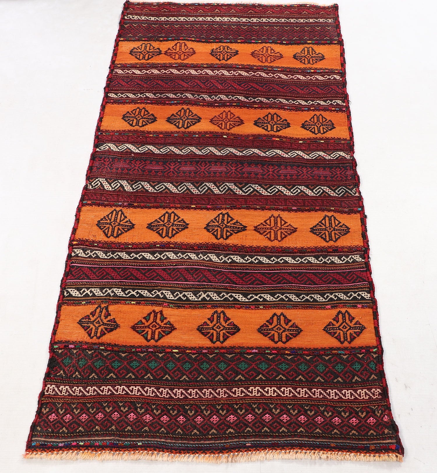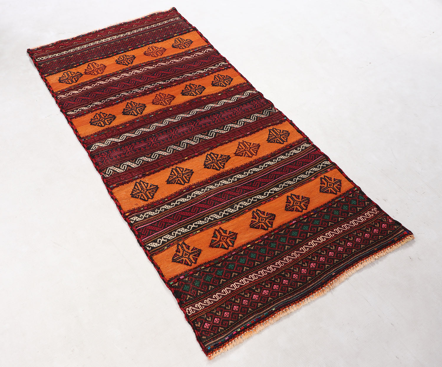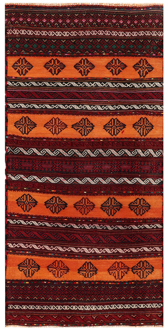 The Sufra rug, traditionally used as a multipurpose floor spread, combines durable flat-weave construction with simple, functional patterns. Its practical design fits perfectly in casual or utility spaces.