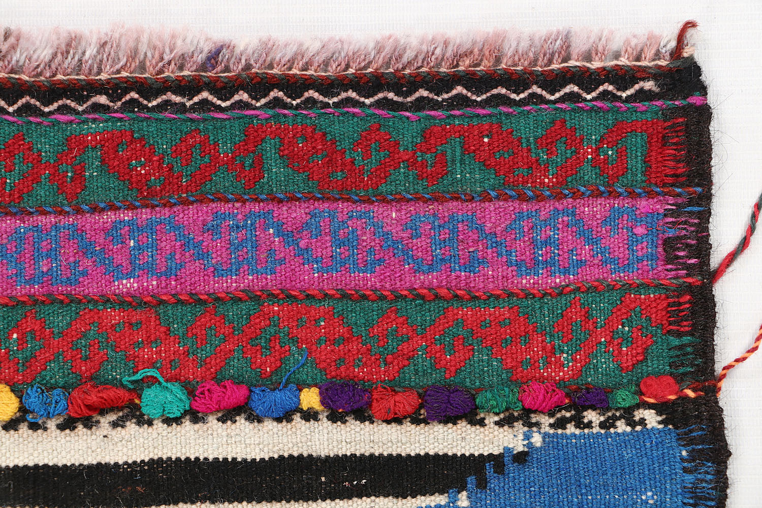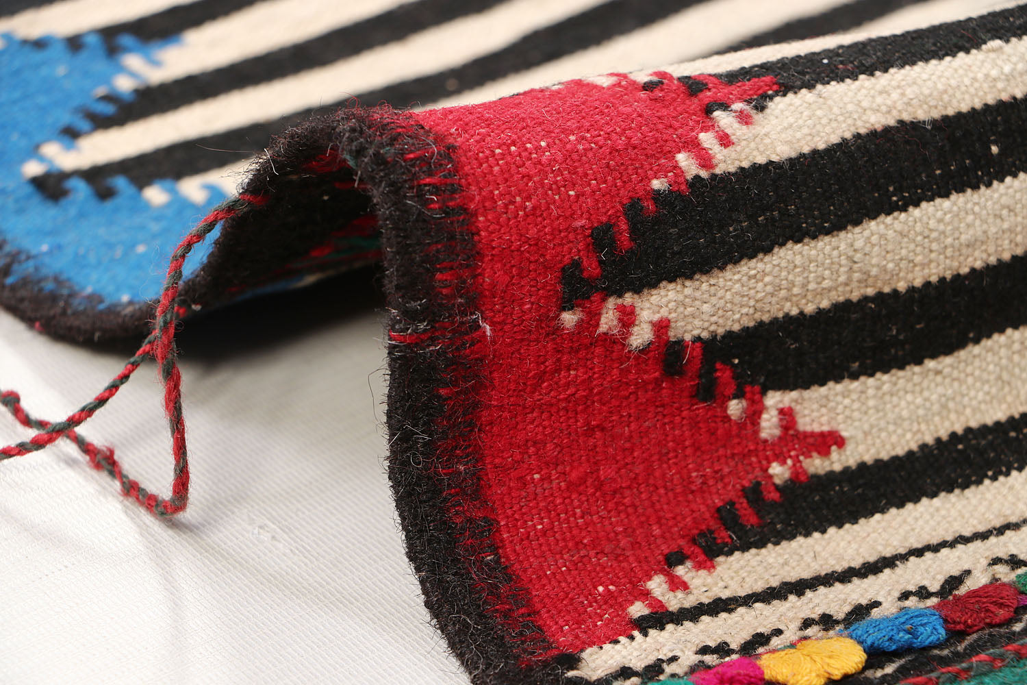 The Sufra rug, traditionally used as a multipurpose floor spread, combines durable flat-weave construction with simple, functional patterns. Its practical design fits perfectly in casual or utility spaces.
