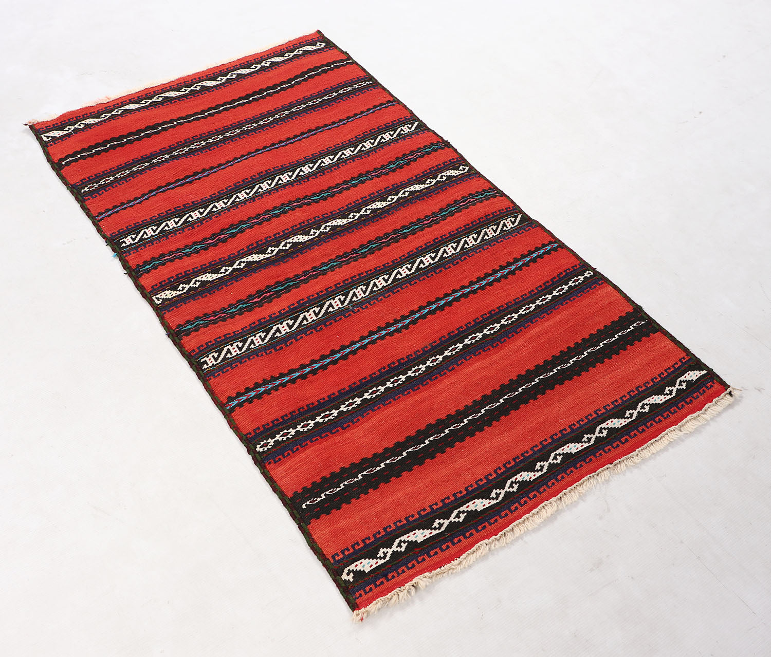 The Sufra rug, traditionally used as a multipurpose floor spread, combines durable flat-weave construction with simple, functional patterns. Its practical design fits perfectly in casual or utility spaces.