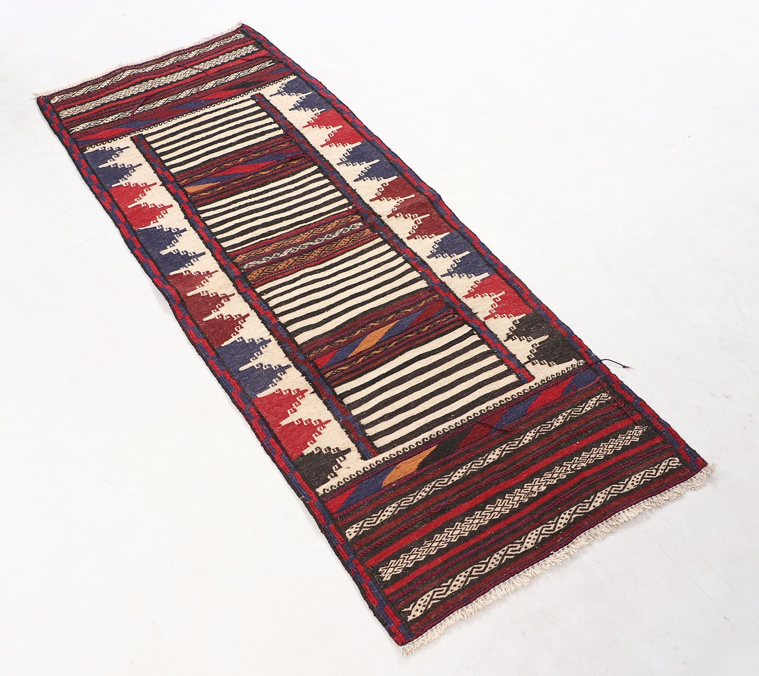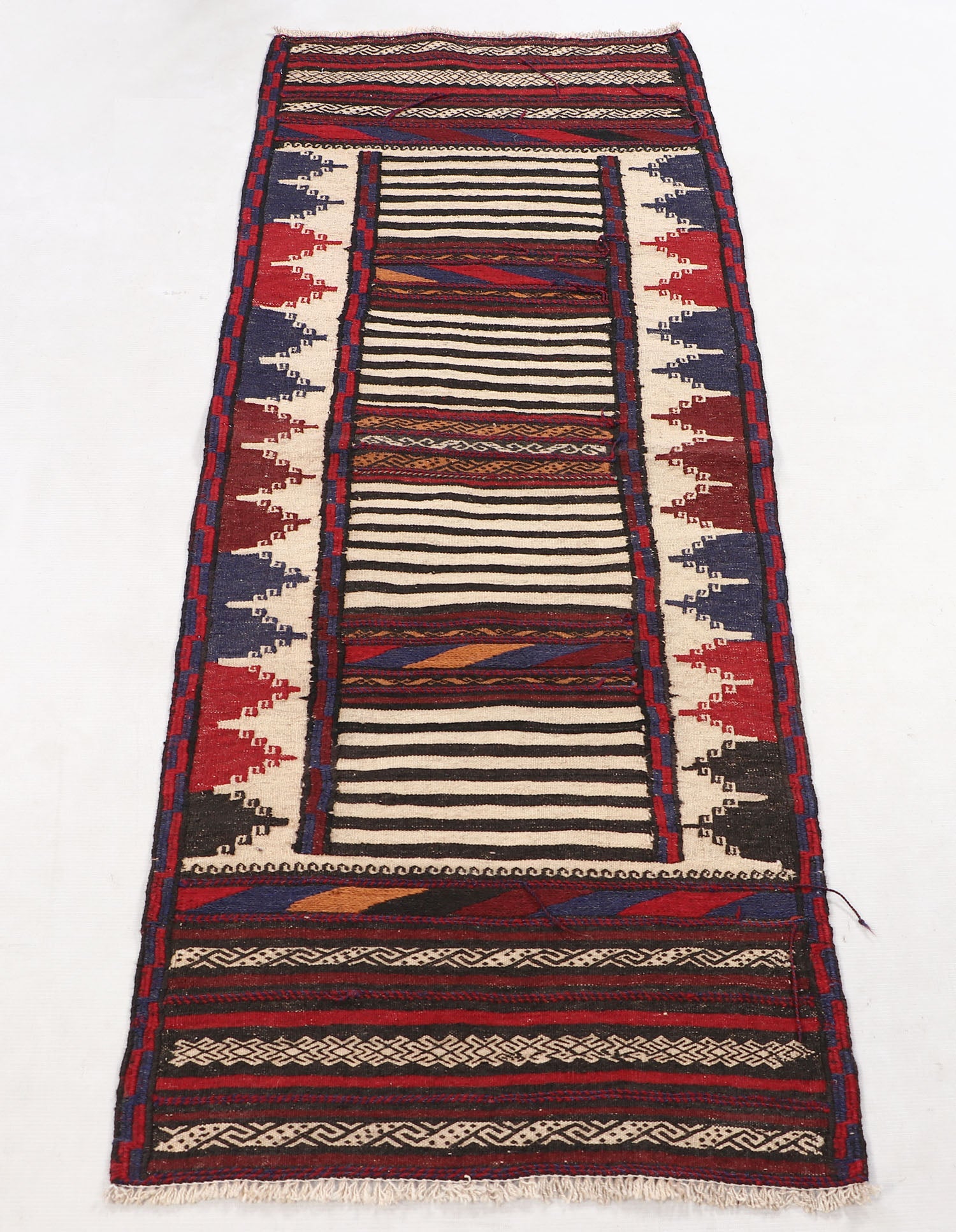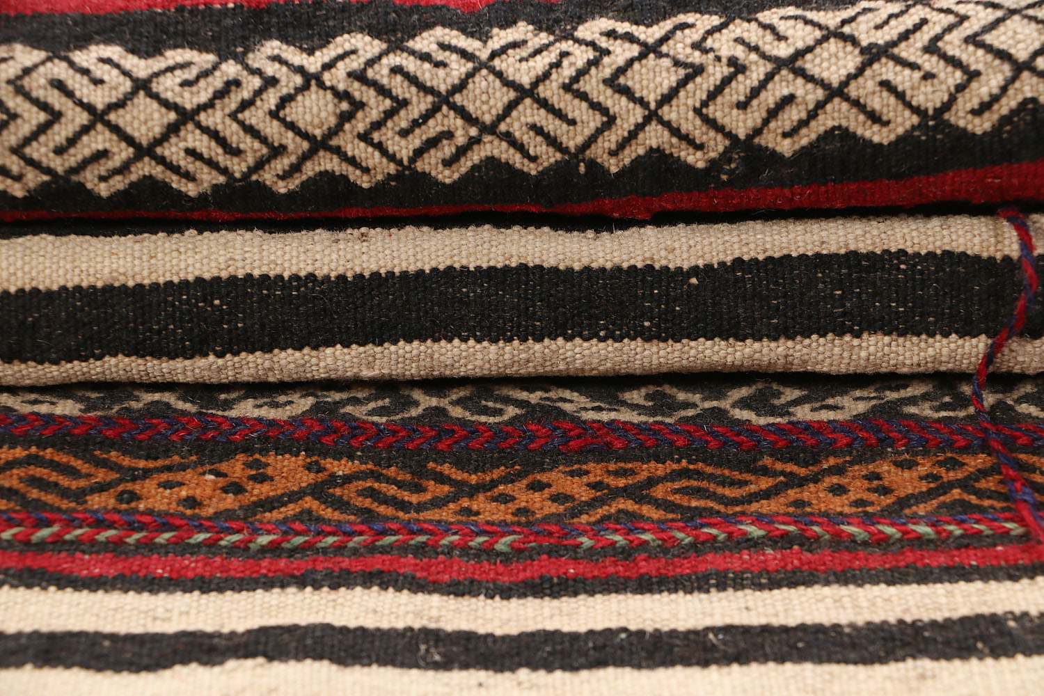 The Sufra rug, traditionally used as a multipurpose floor spread, combines durable flat-weave construction with simple, functional patterns. Its practical design fits perfectly in casual or utility spaces.