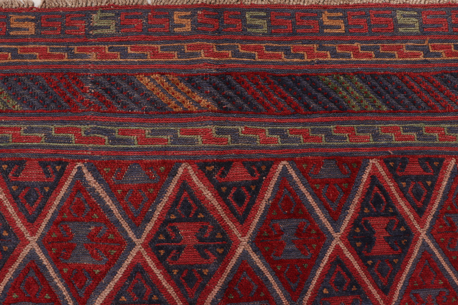 The Mashwani rug stands out with its bold geometric patterns and a combination of kilim and pile weaving techniques. Its vibrant colors and durable wool construction make it a versatile choice for various décor styles.